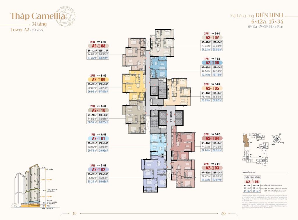 Mặt bằng Tầng điển hình Tòa A2: Tòa Camellia được thiết kế cao 34 tầng với số lượng 295 căn hộ đa dạng từ 1PN – 2PN – 3PN. Một sàn tại đây chỉ có 10 căn hộ với 5 thang máy.