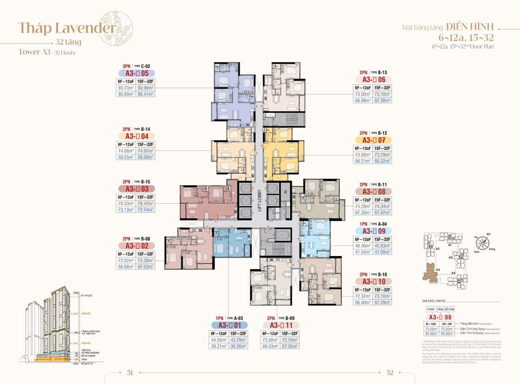 Mặt bằng Tầng điển hình Tòa A3: Tòa Lavender được thiết kế cao 32 tầng với số lượng 303 căn hộ đa dạng từ 1PN – 2PN – 3PN. Một sàn tại đây chỉ có 11 căn hộ với 6 thang máy.
