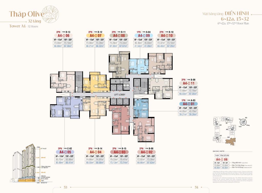 Mặt bằng Tầng điển hình Tòa A4: Tòa Olive được thiết kế cao 32 tầng với số lượng 303 căn hộ đa dạng từ 1PN – 2PN – 3PN. Một sàn tại đây chỉ có 11 căn hộ với 6 thang máy.