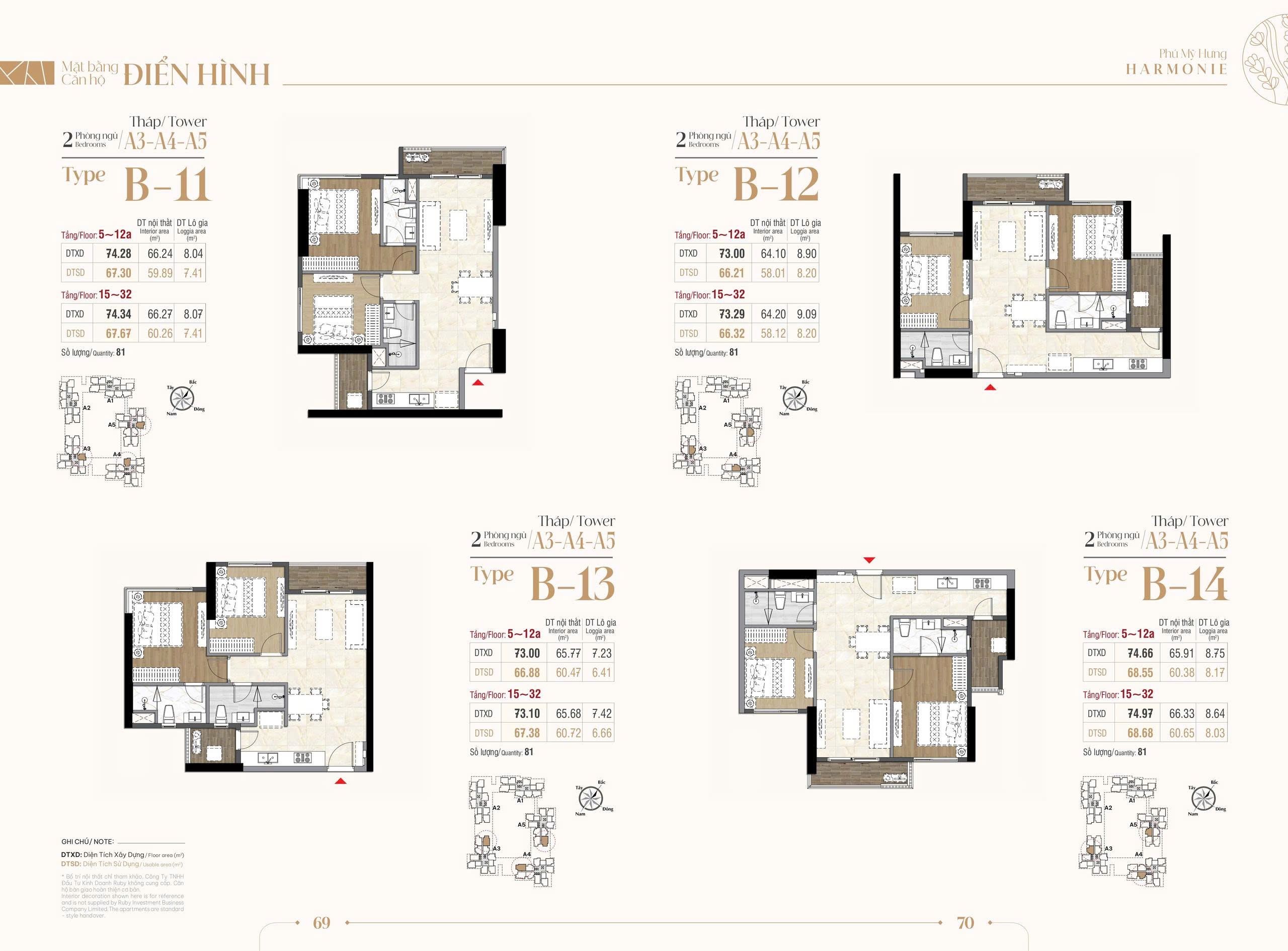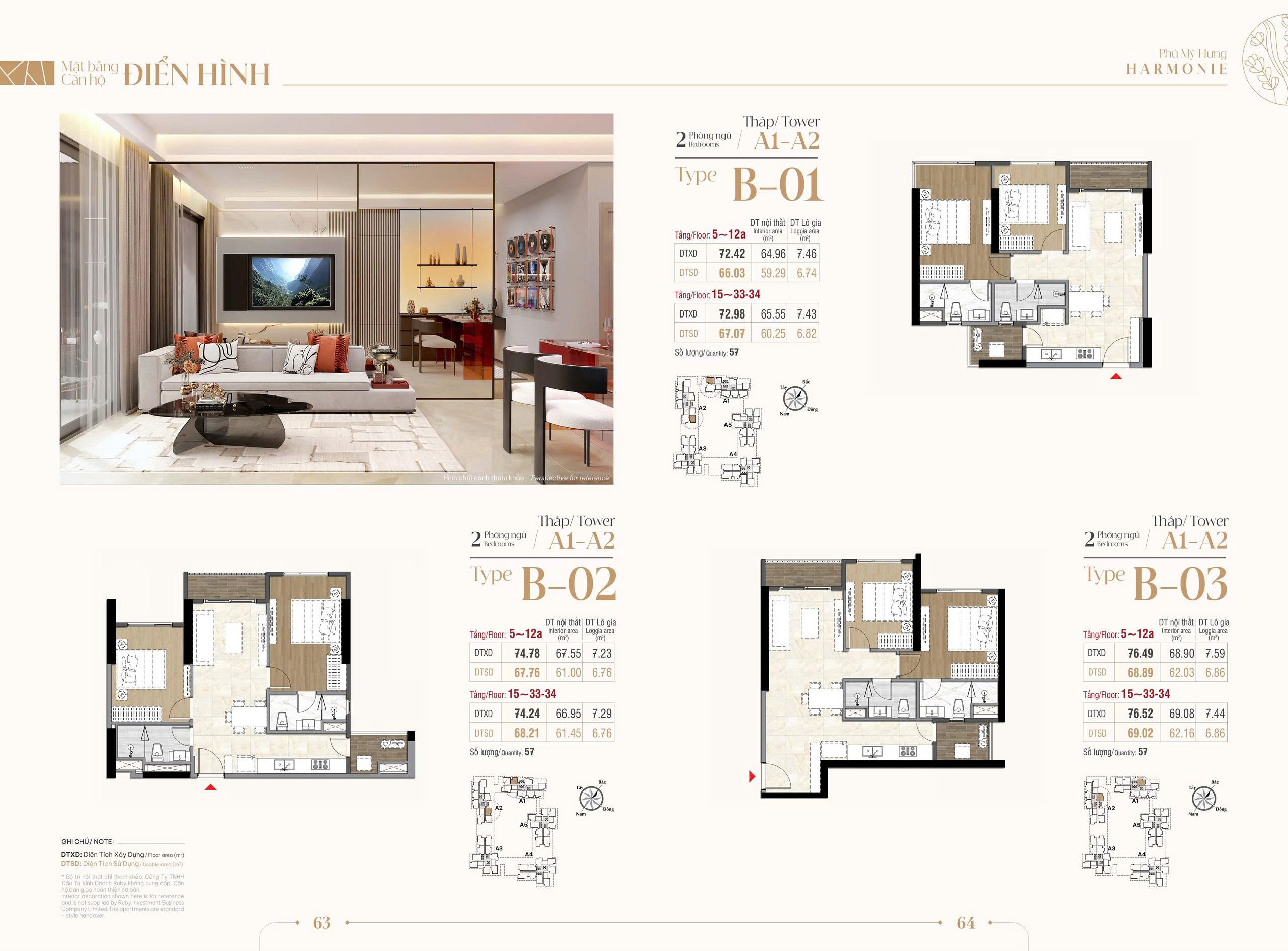 • 1047 căn hộ 2 phòng ngủ ( 72.37 m2 – 79.47 m2)
